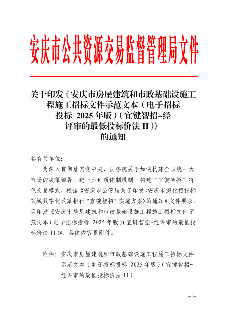 關于印發(fā)《安慶市房屋建筑和市政基礎設施工程施工招標文件示范文本(電子招標投標 2025年版)(宜鍵智招-經(jīng)評審的最低投標價法II)》的通知